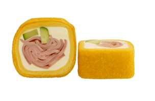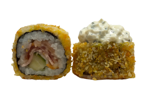 Темпурный ролл с копченой куриной грудкой, помидором, листом салата, сырно-чес...